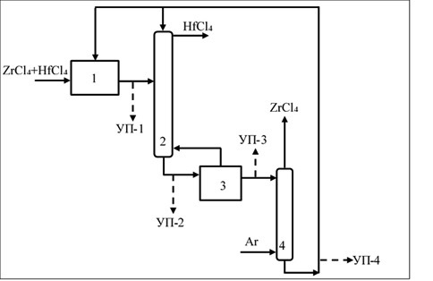 Рис. 3. Принципиальная схема установки: 1 – узел приготовления разделяемой смеси хлоридов циркония и гафния; 2 – ректификационная колонна; 3 – испаритель; 4 – десорбционная колонна; точки пробоотбора: УП-1 – после растворения разделяемой смеси ZrCl4 и HfCl4 в расплаве KCl – AlCl3; УП-2 – после ректификационной колонны; УП-3 – после кипятильника ректификационной колонны; УП-4 – после десорбции ZrCl4 потоком инертного газа.
