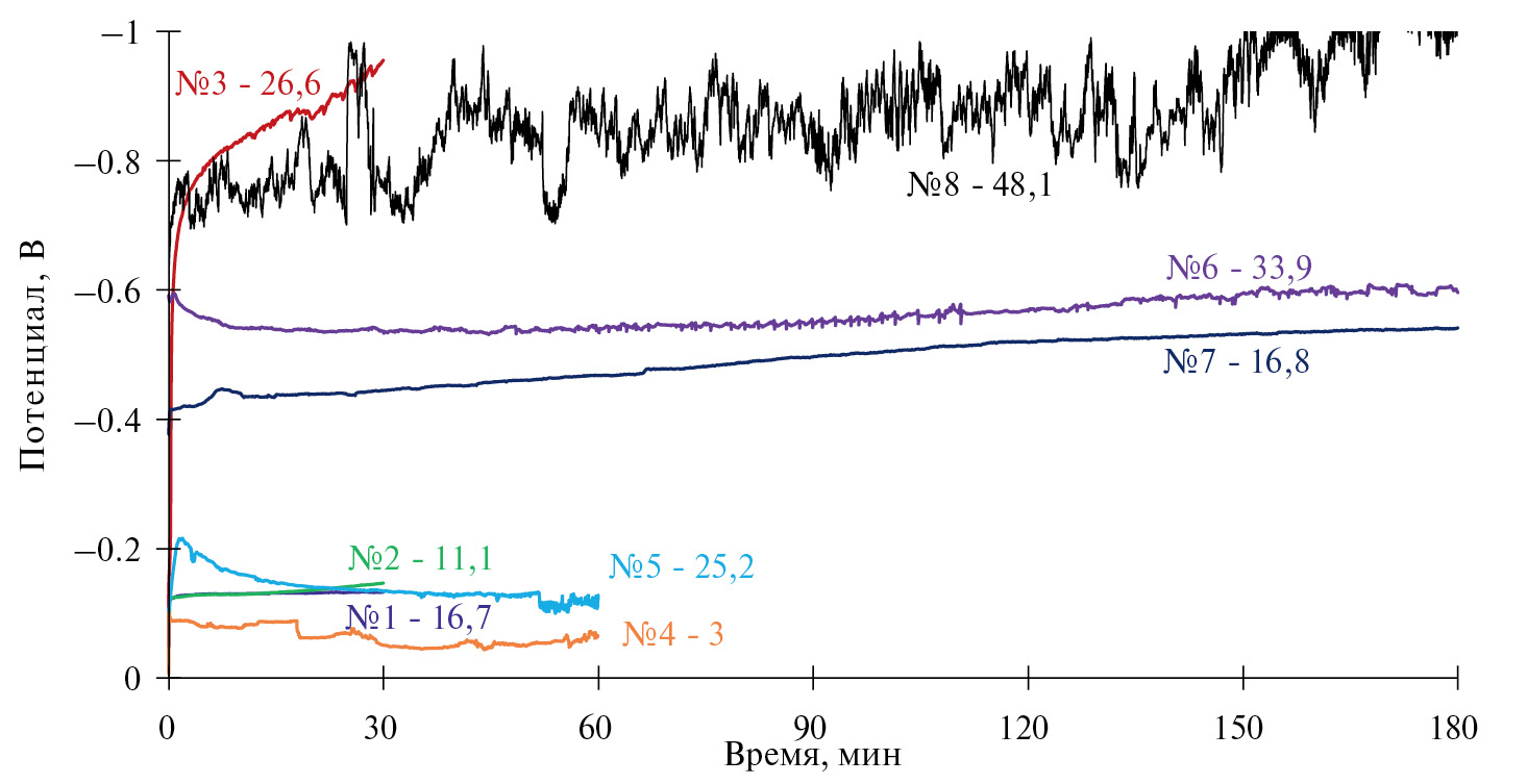 На рис. 1 представлены зависимости изменения потенциала стеклоуглеродных электродов в ходе электролиза в зависимости от катодной плотности тока. Наблюдается общая тенденция смещения потенциала электрода в отрицательную область с ростом катодной плотности тока и времени электроосаждения. При этом из общей закономерности явно выпадает зависимость изменения потенциала для образца 3 (плотность тока осаждения 26.6 мА/см2): потенциал электрода сначала резко, а затем более плавно смещался в область отрицательных значений вплоть до –1 В.