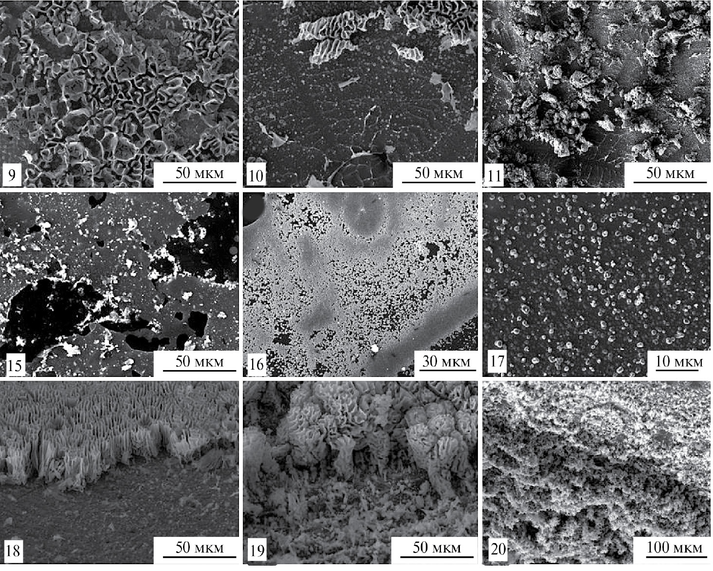 На рис. 5 представлены микрофотографии некоторых типичных осадков кремния, полученных при электролизе расплава LiCl–KCl–CsCl–K2SiF6 в гальваноимпульсном режиме. Осадки были преимущественно представлены сферолитными зародышами, равномерно покрывающими рабочую поверхность электрода. На отдельных участках равномерного осадка кремния имеются дендриты, высота которых на порядок превышала диаметр зародышей (образцы 9–11, 18–20).