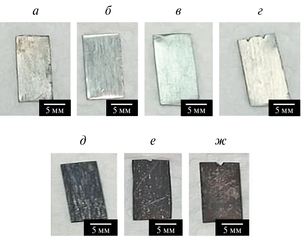 Рис. 2. Внешний вид образцов сплава 29НК после коррозионных испытаний, в расплавах: а LiCl-KCl; б LiCl-KCl–0.2 мол. % Li2O; в LiCl-KCl–0.5 мол.%Li2O; г LiCl–KCl–2.0 мол.% Li2O; д LiCl-KCl–0.2мол.%LiOH; е LiCl–KCl–0.5 мол.%LiOH; ж LiCl–KCl–2.0 мол.%LiOH.