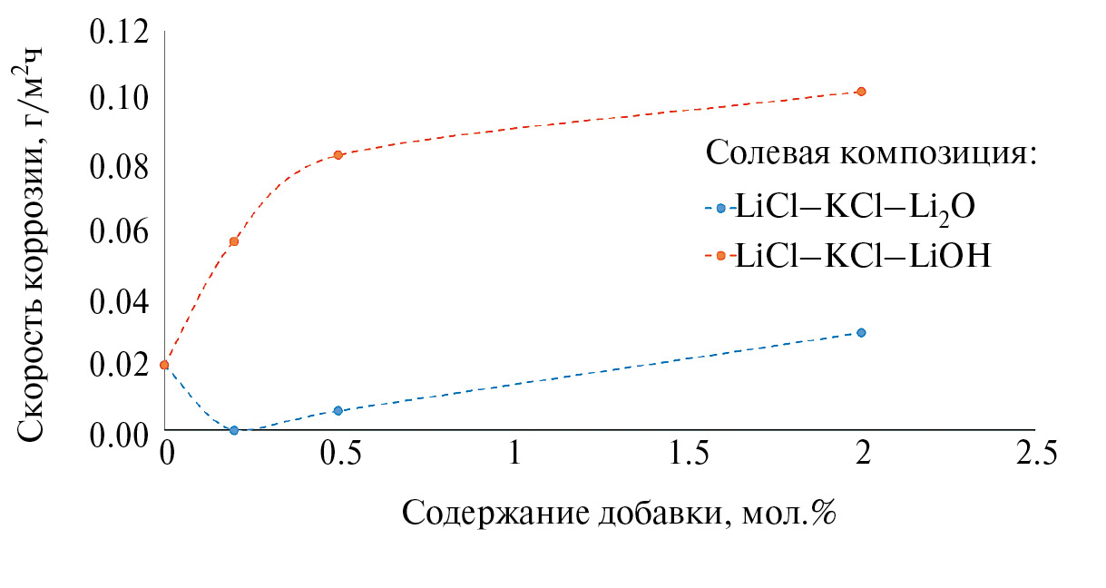 При введении в расплав оксида лития наблюдается снижение скорости коррозии при концентрации Li2O, равной 0.2 мол. %. При иных концентрациях значения скоростей коррозии сопоставимы с результатами, полученными в эвтектическом расплаве LiCl–KCl.