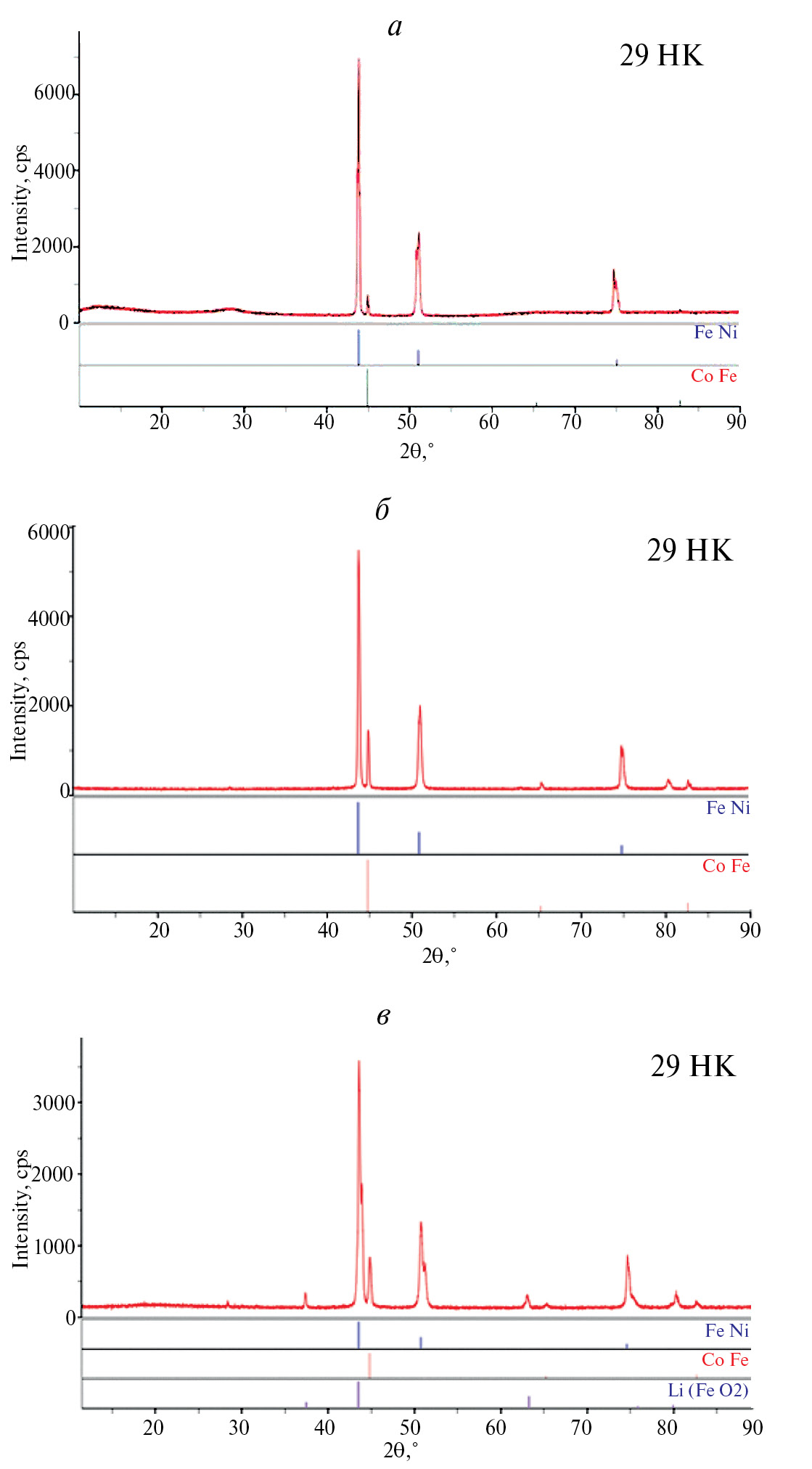 Рис. 5. РФА поверхности образцов сплава 29НК, выдержанных при температуре 500 оС в расплавах: а LiCl–KCl; б LiCl-KCl–2%Li2O; в LiCl–KCl–2%LiOН композициях на основе LiCl–KCl.
