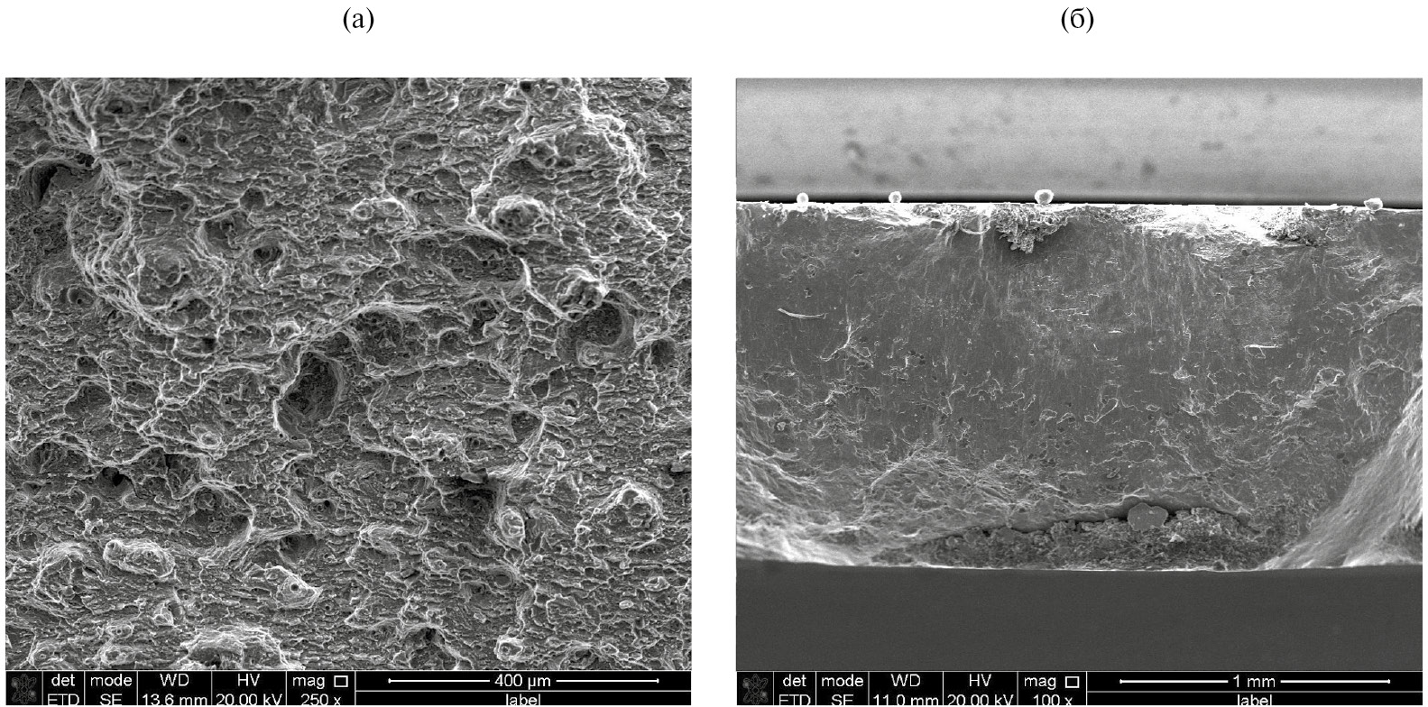 Рис. 3. РЭМ-изображение излома образца из материала AlSi10Mg: а – в исходном состоянии; б – после прокатки.