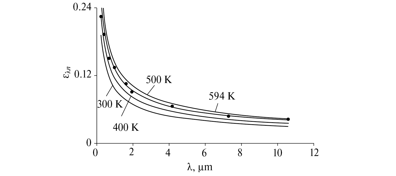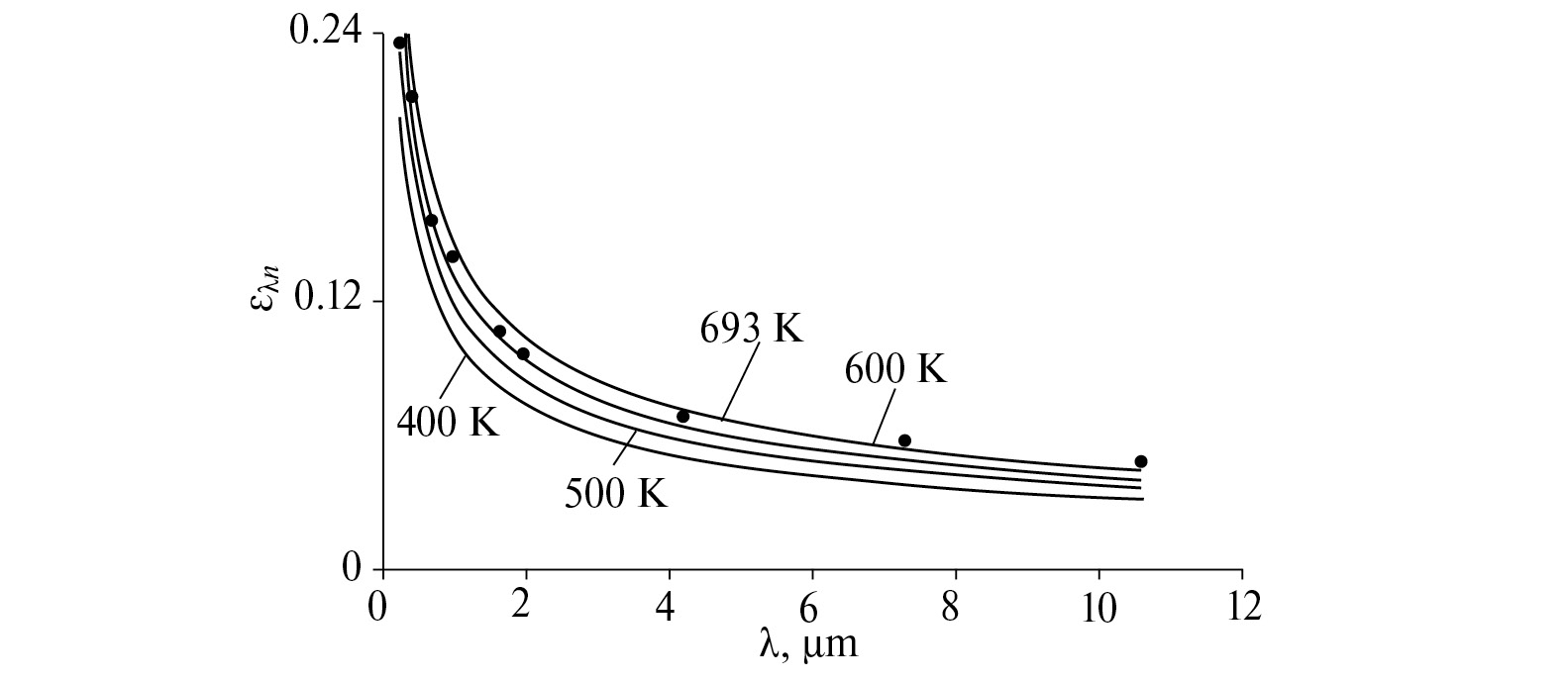 В металлургической практике для теплотехнических расчетов часто необходимо знание свойств теплового излучения металлов и сплавов в широком диапазоне температур и длин волн [1–4]. В бесконтактной радиационной пирометрии также необходимы знания этих параметров. Любое тепловое излучение несет важную информацию об электронном строении твердого и жидкого состояния кристаллической решетки.