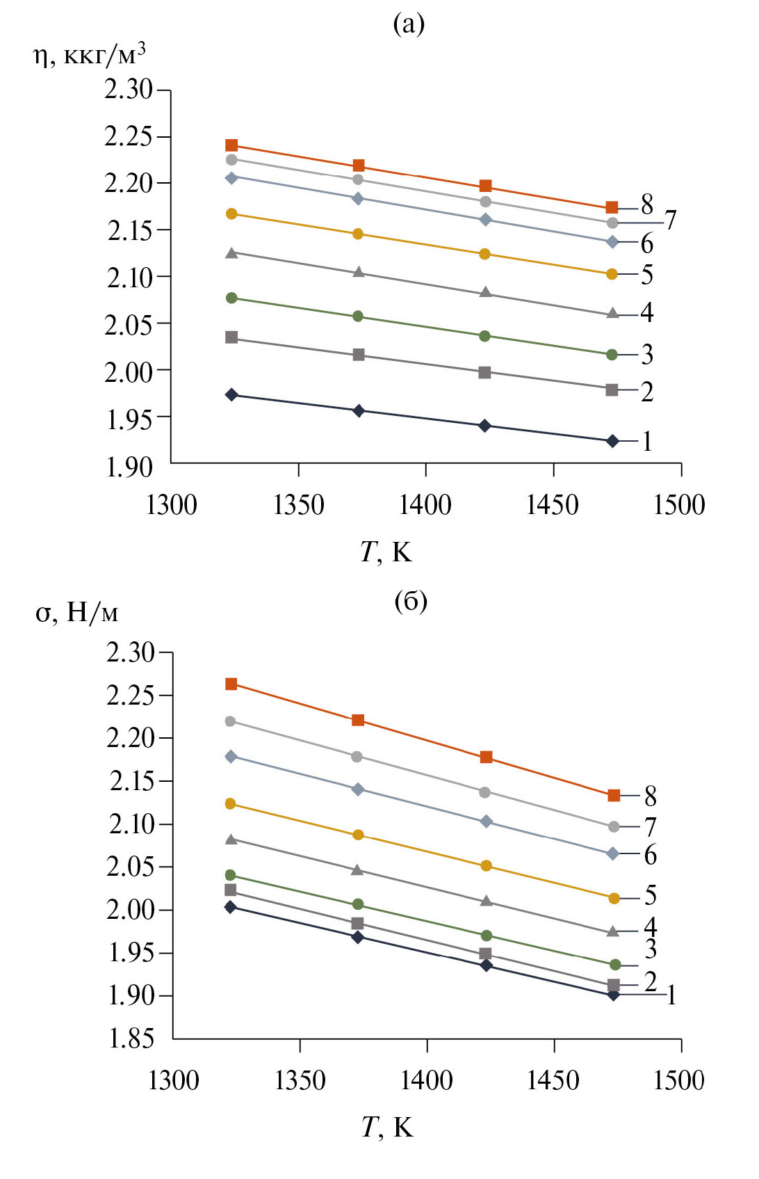 Рис. 1. Зависимость плотности (a) и поверхностного натяжения (b) от температуры и концентрации сульфата кальция в расплаве, %: 1 – 0, 2 – 10, 3 – 20, 4 – 30, 5 – 40, 6 – 50, 7 – 55, 8 – 60.