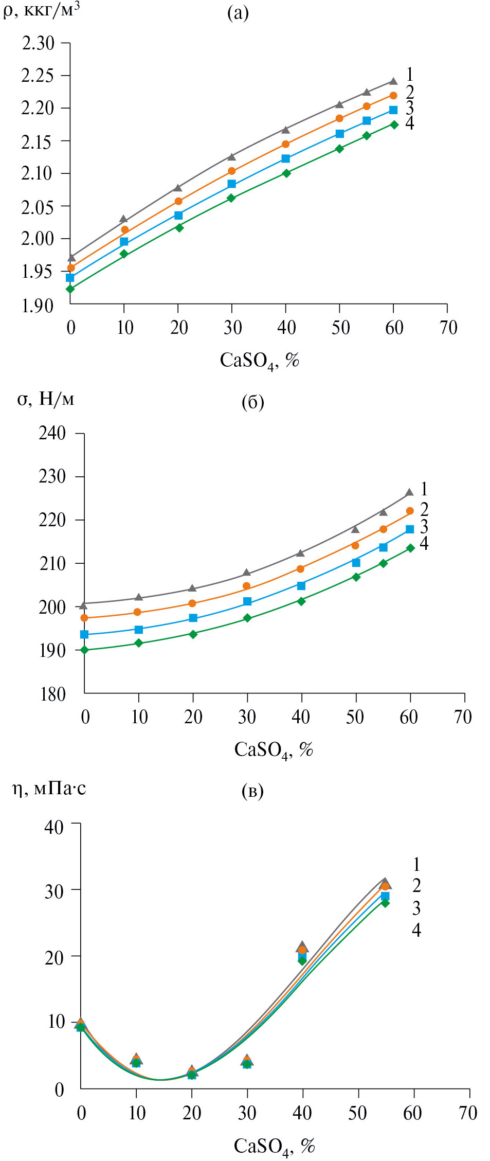 Рис. 3. Влияние состава расплавов Na2SO4– CaSO4 на плотность (a), поверхностное натяжение (b) и вязкость (c) при температурах, °С: 1–1050, 2–1100, 3–1150, 4– 1200.