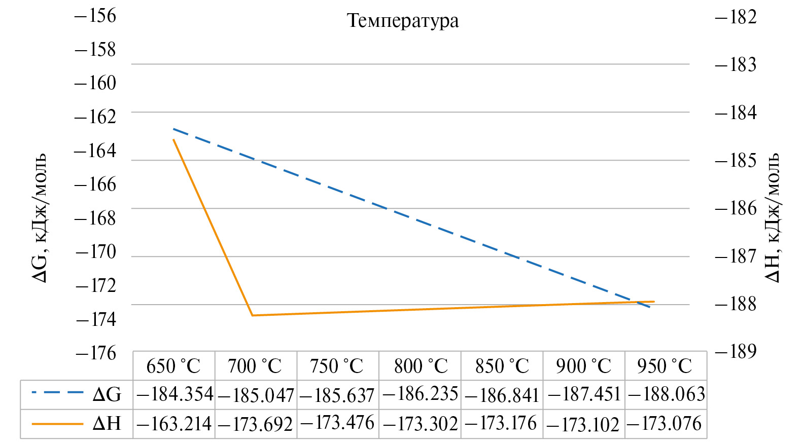 Также в работе был проведен расчет термодинамических параметров химической реакции AlB2 + V = VB2 + Al. В табл. 2 и рис. 6 приведены расчетные значения ΔGT, ΔHT, ΔST, logKp.