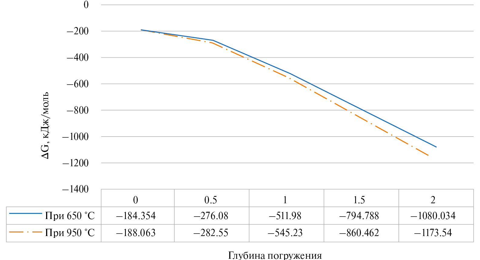 Рис. 10. Зависимость изменения энергии Гиббса от глубины погружения навески флюса на основе бора в расплав алюминия при температуре 650 0С и 950 0С (крайние точки диапазона рабочей температуры) для реакции AlB2 + V = VB2 + Al.
