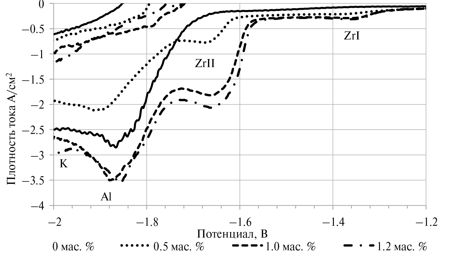 В предыдущей серии исследований нами было изучено электрохимическое поведение ионов циркония на стеклоуглероде и вольфраме во фторидных расплавах. Согласно ранее полученным результатам (рис. 2) при наличии ZrO2 в расплаве KF-AlF3-Al2O3 на катодной ветви вольтамперограмм появляются площадка и пик разряда электроактивных ионов при потенциалах –1.4 и –1.7 В, ZrI и ZrII, соответственно.