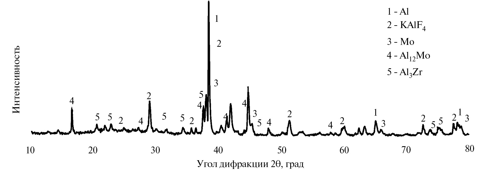Часть катодного осадка была механически отделена от катода для анализа его химического и фазового состава. На рисунке 5 представлена дифрактограмма катодного осадка, состоящего преимущественно из соединений Al3Zr и алюминия с примесями молибдена, Al12Mo и KAlF4, что согласуется с известными представлениями об образовании интерметаллидных соединений при взаимодействии алюминия с другими металлами [11–15].