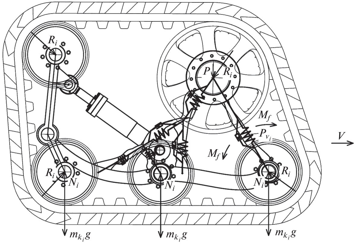 A mathematical model of a heavy-duty track modular unit, in which the mechanical suspension damper is a topologically optimized elastic frame with superelastic reinforcing elements made of a composite material with thermoelastic martensitic transformations, is proposed. The model is used to evaluate the internal force factors arising at the points of contact between the track rollers and the support platform. The model allows taking into account the influence of the dynamic load from the inertia of the nodes and parts of the mechanism. This model can be used to analyze the impact of the failure of the track rollers of tracked vehicles on the redistribution of forces between the remaining serviceable rollers. Based on the results of loading simulation, dependencies are obtained that make it possible to judge the level of loading of the support wheels in two operation modes; recommendations are given for further refinement of the model.