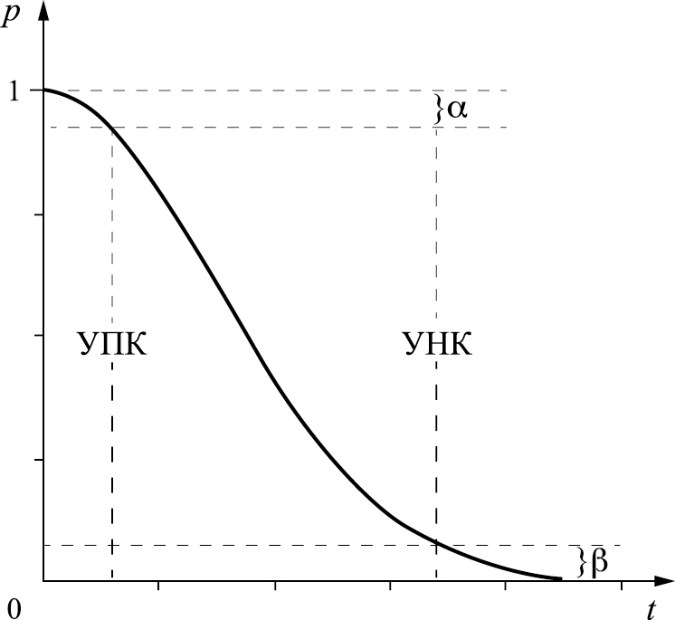 Процесс введения поправок на основе контрольных карт. Рассмотрим ситуацию, когда контрольные карты могут применяться для выявления нежелательных рабочих условий и последующего определения необходимых корректировочных действий. При приемочном контроле измеряются некоторые характеристики продукта, согласно некоторому выборочному плану берется случайная выборка объема n, вычисляются выборочное среднее и выборочное стандартное отклонение и для проверки нулевой гипотезы применяется критерий значимости. С нулевой гипотезой связаны альтернативная гипотеза и ошибки первого и второго рода. Потребитель, приобретающий этот продукт, устанавливает предел, ниже которого продукт считается непригодным к использованию, и именно он определяет альтернативную гипотезу. На рис. 1 изображена кривая оперативной характеристики для типичного выборочного плана. Представлена вероятность р приемки партии от доли – t дефектной продукции, где α и β – риск производителя.