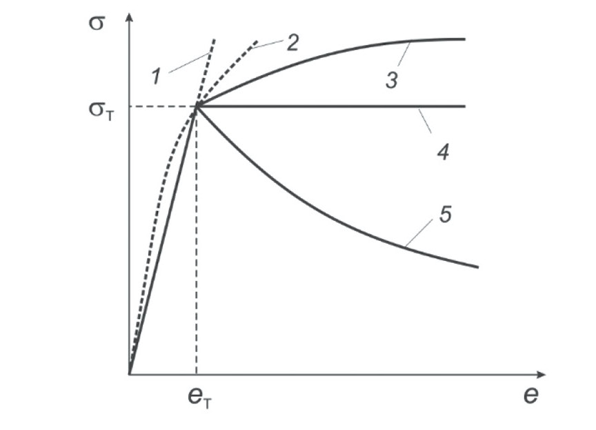 Рис. 2. Виды диаграмм деформирования материалов с различной степенью упрочнения и разупрочнения: 1 – упругое деформирование; 2 – деформирование по степенному закону из исходного состояния; 3 – упругое и неупругое деформирование с упрочнением по степенному закону; 4 – идеальное упругопластическое деформирование; 5 – упругое и неупругое деформирование с разупрочнением по степенному закону