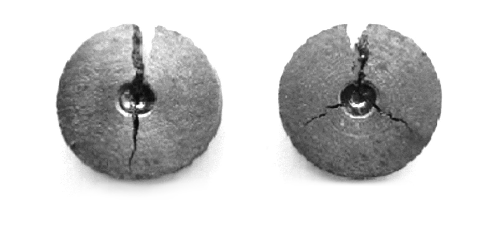 Две трещины имели более 30% образцов, три ‒ около 40% и четыре – менее 30%. Количество трещин не зависело от магнитного состояния образцов. Возможно, что количество радиальных трещин зависит от неоднородности структуры и состава материала образцов.