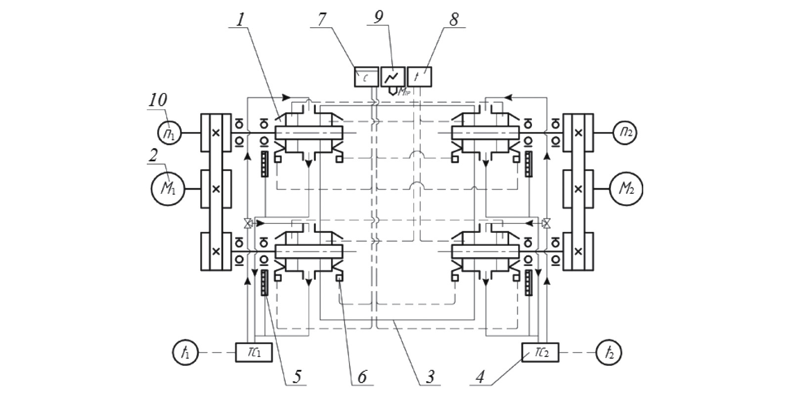 Основными узлами стенда являются четыре модуля с рабочими камерами, в каждой из которых размещены по два испытуемых уплотнительных узла. Модули распределены на два автономных блока с индивидуальными приводами и гидравлическими системами. Привод валов каждого блока осуществляется через клиноременную передачу от электродвигателей типа П2201У4 мощностью по 2.2 кВт с плавной регулировкой частоты вращения вала в диапазоне 50–3000 мин–1. Рабочие камеры каждого блока связаны теплоизолированными трубопроводами с термостатами типа ТС-24, обеспечивающими циркуляцию, термоизоляцию и нагрев рабочей жидкости в диапазоне температур 20–120 °С. Уровень рабочей жидкости в камерах контролируется стеклянными уровнемерами и регулируется дросселями на напорных и сливных магистралях. Проточная циркуляционная система подачи рабочей жидкости и сведение к минимуму застойных зон обеспечивают достаточную стабильность концентрации механических примесей абразива в рабочей жидкости при его наличии.