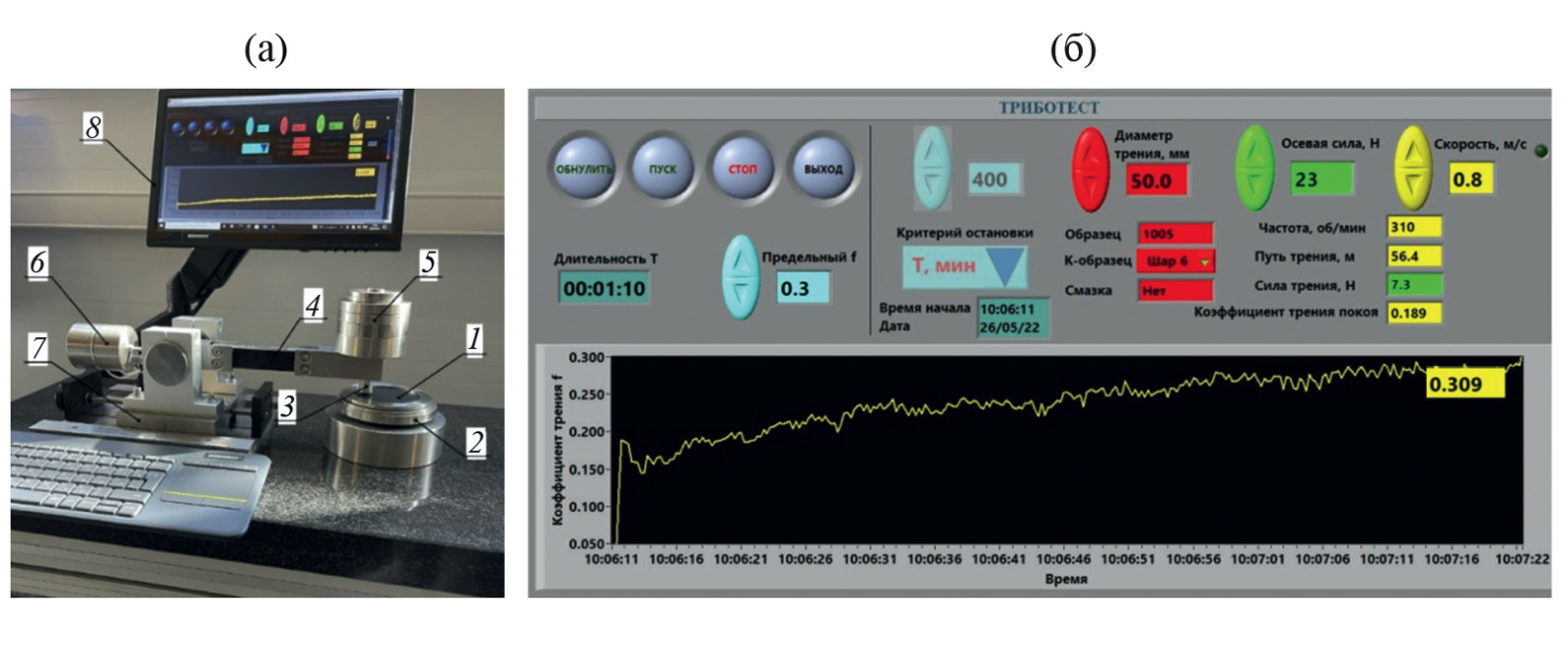 Рис. 1. Внешний вид машины трения ТРИБОТЕСТ “Шар–Диск-01” (а), лицевая панель программы для управления и сбора данных (б); 1 – образец с покрытием; 2 – патрон; 3 – индентор с контробразцом; 4 – тензодатчик; 5 – грузы; 6 – балансир; 7 – подвижная каретка; 8 – экран с сенсорным управлением