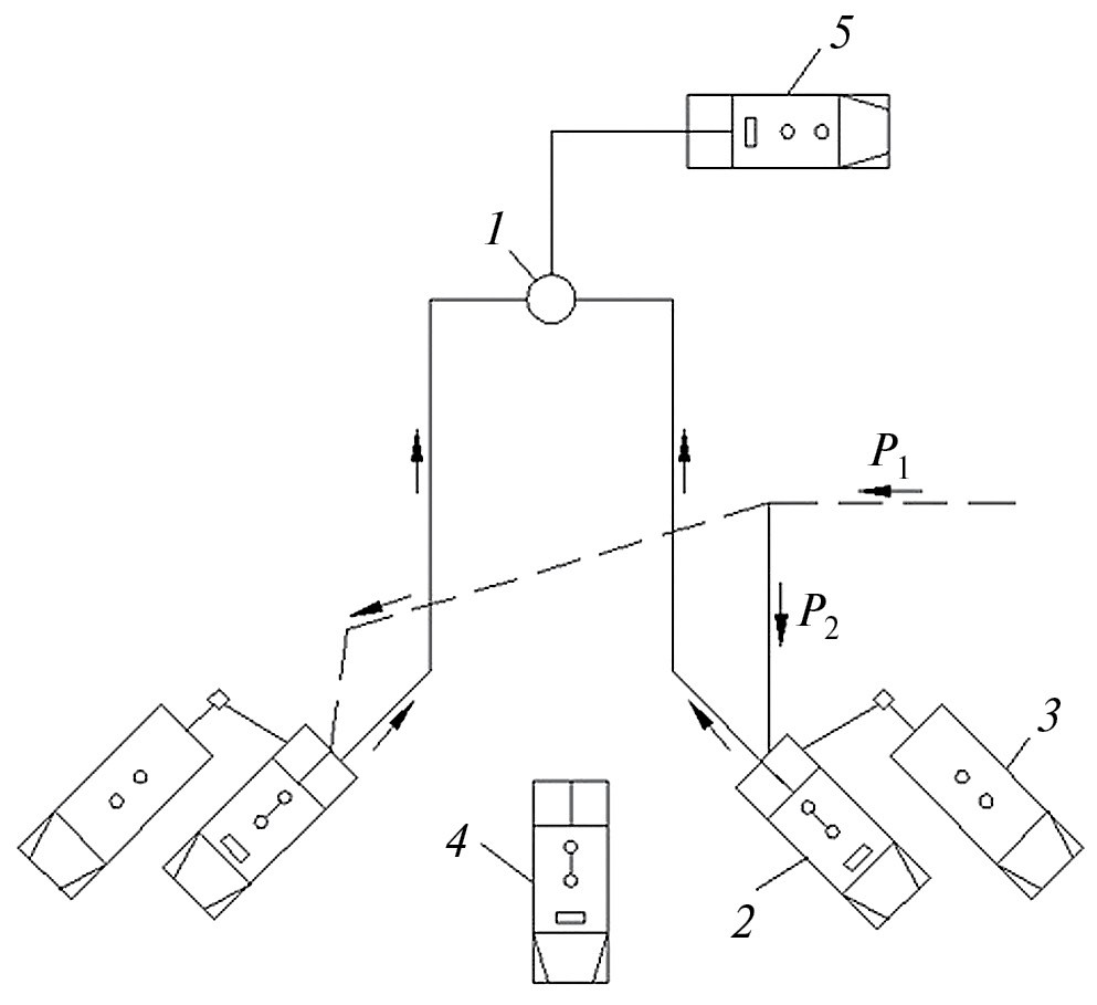 Рис. 1. Функциональная схема обвязки установок при цементировании кондукторов и неглубоких промежуточных колонн: 1 – скважина; 2 – насосная установка; 3 – смесительная установка; 4 – насосная установка резервного назначения; 5 – насосная установка, участвующая в продавке разделительной пробки.