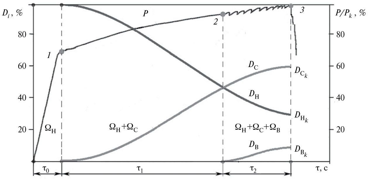 Концепция предполагает, что на начальной стадии упругого деформирования τ0 в композитном материале возникают только рассеянные микроповреждения, весовое содержание которых составляет DН = 100%, а поверхность их разрушения ΩH по данным микроскопии исследованных образцов однонаправленного ламината не превышает 100 мкм2 [16, 17]. На стадии τ1 неупругого деформирования материала в результате эволюции микроповреждения достигают мезомасштабного уровня с поверхностью разрушения ΩС = 100–1000 мкм2, что сопровождается снижением парциального содержания микроповреждений DН и повышение мезоповреждений DС. На стадии τ2 предельного состояния локальные мезоповреждения достигают макромасштабного уровня с поверхностью разрушения ΩВ > 1000 мкм2, что сопровождается дальнейшим падением содержания микроповреждений DН и синхронным возрастанием мезо- DС и макроповреждений DВ, которые при повышении до критических значений DСk и DВk вызовут разрушение материала в зонах их накопления. Отслеживая в режиме нагружения перераспределение парциального содержания повреждений на разных масштабных уровнях, составляющих в сумме DН + DС +DВ = 100%, и сопоставляя их с критическими (пороговыми) значениями DНk, DСk и DВk, можно контролировать фактическое состояние несущей способности изделия.