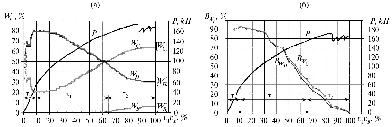 Динамика изменения потоковых параметров Wi (рис. 2а) наглядно свидетельствует о том, что наиболее информативными, отражающими кинетику парциальных повреждений в структуре композитного материала, являются параметры WН и WС. Если параметр WС отражает только парциальное изменение мезоповреждений в структуре пакета ПКМ, то параметр WН = 100 – (WС + WВ) дает информацию о суммарном перераспределении мезо- и макроповреждений (DС + DВ) =100 – DН. Сопоставляя текущие значения этих параметров с пороговыми 100 – [WН] и [WС], соответствующими критическим значениям: DСk + DВk = 100 – DНk и DСk (рис. 1), получаем возможность вычислять фактический уровень несущей способности композитного материала в процессе его деформирования [17].