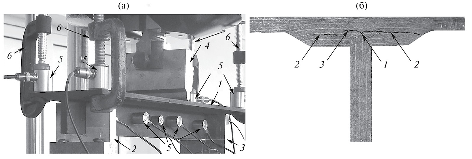 На рис. 3а показан стрингер 1, установленный на жестких опорах 2 и 3 на расстоянии 190 мм от нагружающего клина 4. Позиции 5 и 6 соответствуют положениям преобразователей АЭ и крепящих их струбцин к полкам стрингера.
