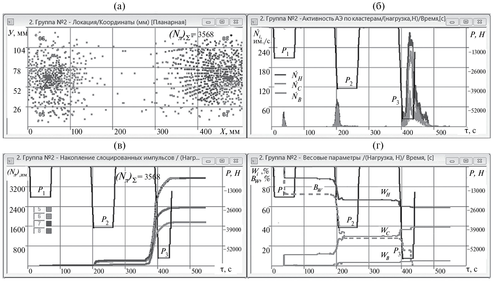 Как следует из графиков на рис. 4б, в, регистрация источников АЭ отмечалась уже на первом этапе испытаний в ходе выдержки при Р1 = –20 кН. На втором этапе в процессе повышения нагрузки до Р2 = –40 кН активность регистрации локационных импульсов в нижнем и среднем кластерах заметно возросла и достигала уже соответственно ŃН = 82 им./с и ŃС = 68 им./с. Наиболее активная локация источников АЭ отмечалась в период выдержки на третьем этапе испытаний при Р3 = –60 кН. При этом парциальная активность в нижнем энергетическом кластере достигала ŃН = 282 им./с, в среднем – ŃС = 235 им./с, в верхнем – ŃС = 114 им./с (рис. 4в). Следствием такой активности явилось существенное перераспределение потоковых параметров Wi в энергетических кластерах (рис. 4г). Если на первом этапе нагружения стрингера экстремальный уровень потоковых параметров в Н, С, В кластерах составлял соответственно: WН = 88% и WС = 11%, WВ = 1%, на втором: WН = 67%, WС = 29%, WВ = 3%, то на третьем при потере устойчивости они достигали пороговых значений: [WН] = 58%, [WС] = 38%, [WВ] = 4%.