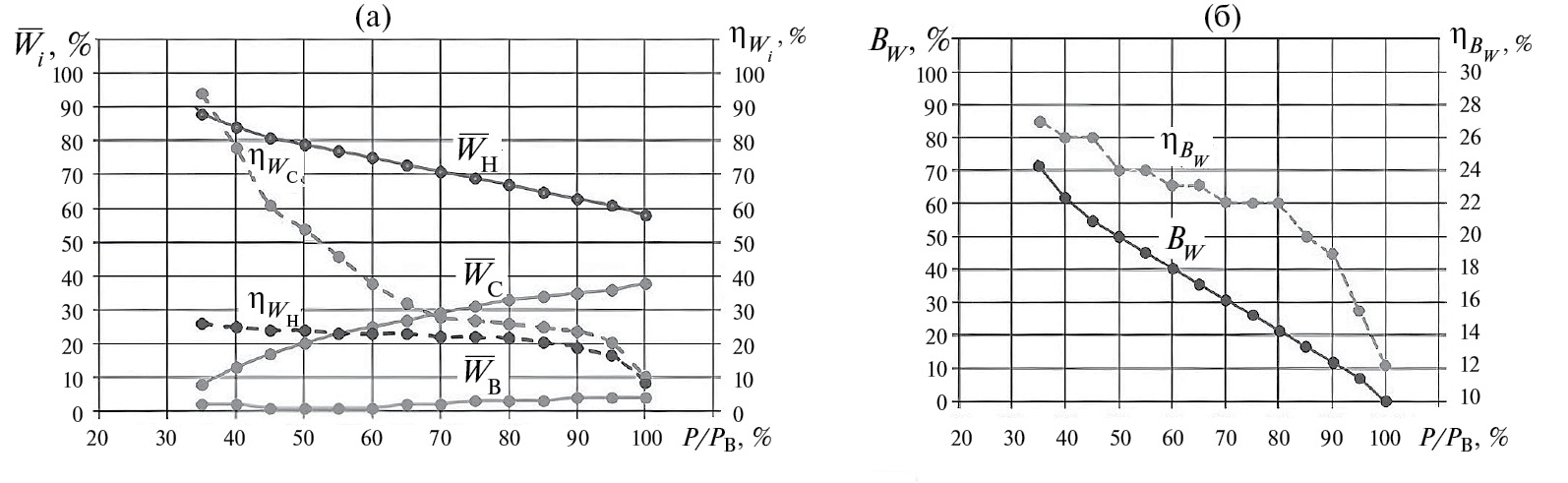Рис. 5. Графики средних выборочных значений параметров в кластерах Н, С, В и уровни их разброса ηWi в интервале ±2S (а), используемые для подсчета несущей способности стрингеров BW и оценки ее возможной погрешности ηBwн (б) при росте соотношения j = Рj/РВ от 35 до 100%.