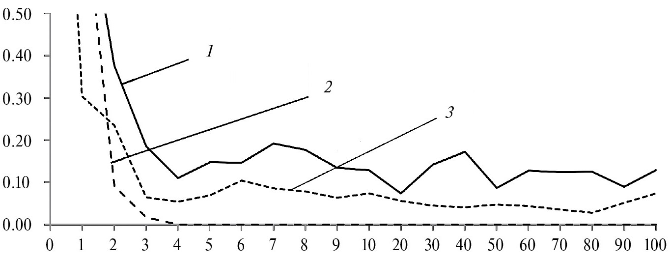 Рис. 7. Сравнительные результаты для ИC140UD26A с другим коэффициентом k сокращения оценки усадки Джеймса–Штейна по индексу Rand: 1 – нормализация по стандартному отклонению; 2 – нормализация по значениям допустимого дрейфа; 3 – по допустимым значениям параметров.