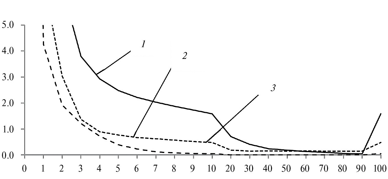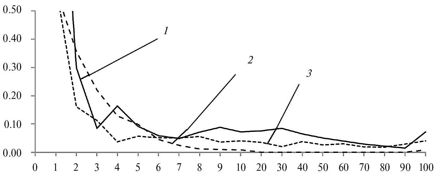 Рис. 2. Сравнительные результаты для ИС 140UD25A с другим коэффициентом k сокращения оценки усадки Джеймса–Штейна на стандартное отклонение значения целевой функции: 1 – нормализация по стандартному отклонению; 2 – нормализация по значениям допустимого дрейфа; 3 – по допустимым значениям параметров.