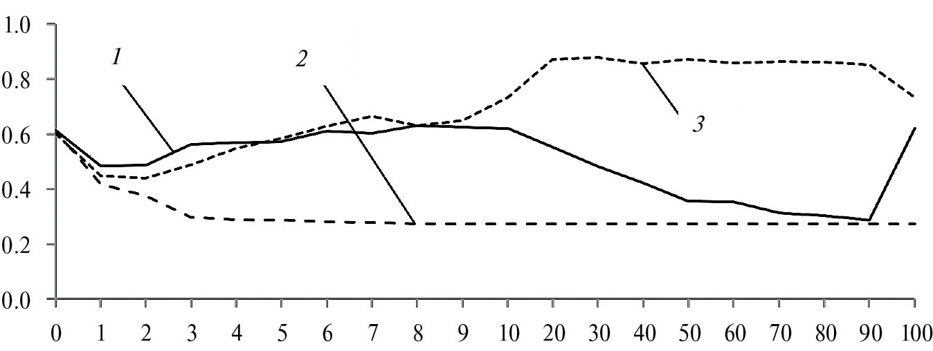 Рис. 3. Сравнительные результаты для ИС 140UD25A с другим коэффициентом k сокращения оценки усадки Джеймса–Штейна по индексу Rand: 1 – нормализация по стандартному отклонению; 2 – нормализация по значениям допустимого дрейфа; 3 – по допустимым значениям параметров.