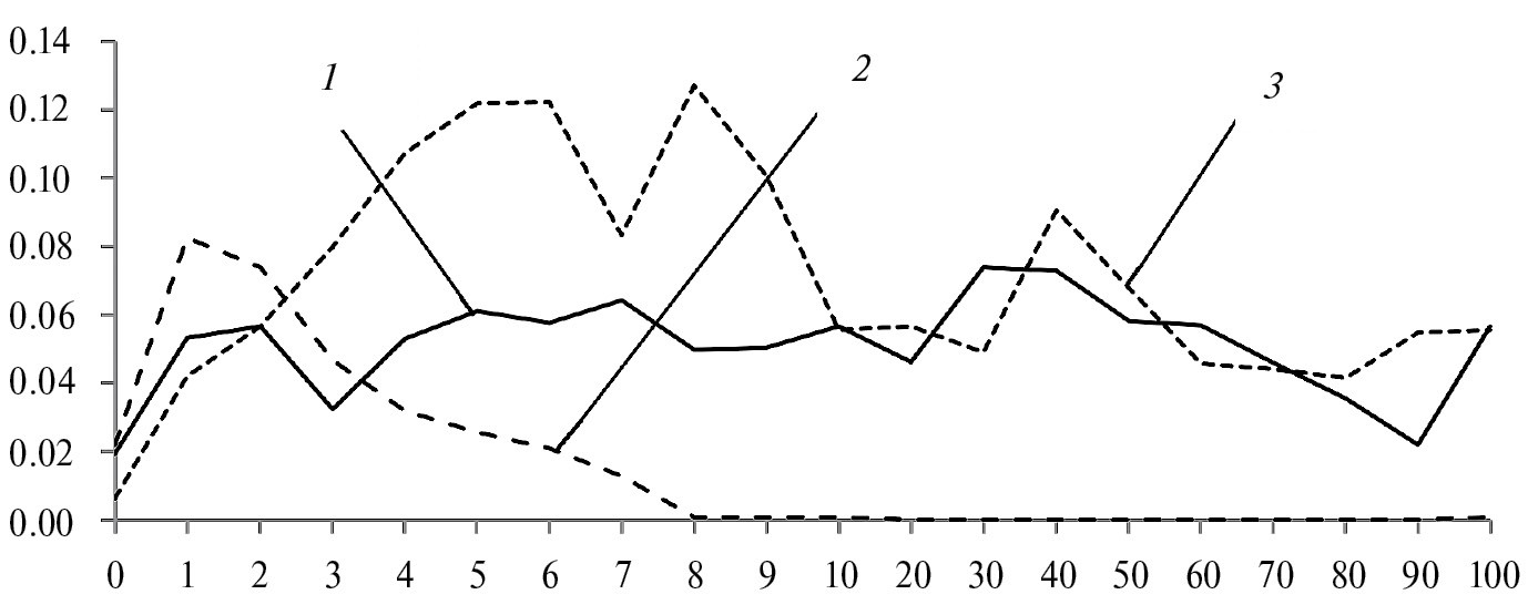 Рис. 5. Сравнительные результаты для ИС 140UD26A с другим коэффициентом k сокращения оценки усадки Джеймса–Штейна на значение целевой функции: 1 – нормализация по стандартному отклонению; 2 – нормализация по значениям допустимого дрейфа; 3 – по допустимым значениям параметров.