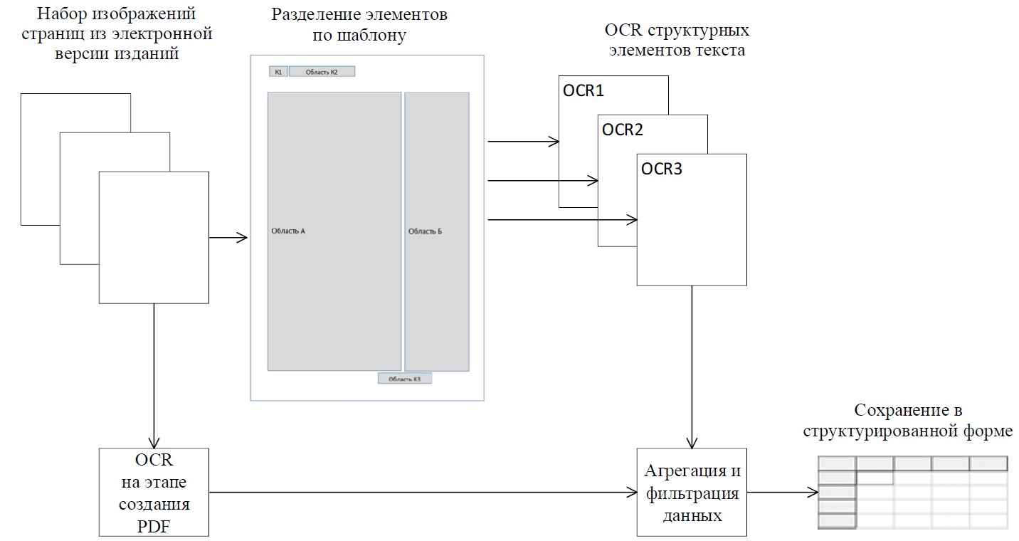 Для сокращения количества ошибок при автоматизированной обработке предлагается гибридная схема, использующая одновременно результат оптического распознавания текста всего документа в целом, не отражающий сведения о структурной разметке текста, а также совокупность результатов распознавания текста, отдельных фрагментов текста согласно шаблону страницы (рис. 1). Результаты объединения текстов сохраняются в БД, содержащей пригодные для использования на портале поля.