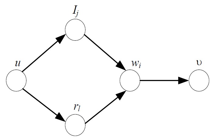 Для решения задачи по примеру [5] построим потоковую сеть G = (N, A), дополнив ее элементами, соответствующими невозобновляемым ресурсам (см. рисунок). Множество узлов определим как N = {u, Ij, rl, wi, v, j = , l = , i = }, где Ij = [yj-1; yj], y0 < y1 < … < yp – все различные величины bi, fi; i = ; u – источник; v – сток; rl соответствует ресурсу l-го типа. Множество дуг A определим как A = {(u, Ij), (u, rl), (Ij, wi), (ri, wi), (wi, v), j = , l = , i = }. Дуга (lj, wi) вводится в сеть G в том случае, если .