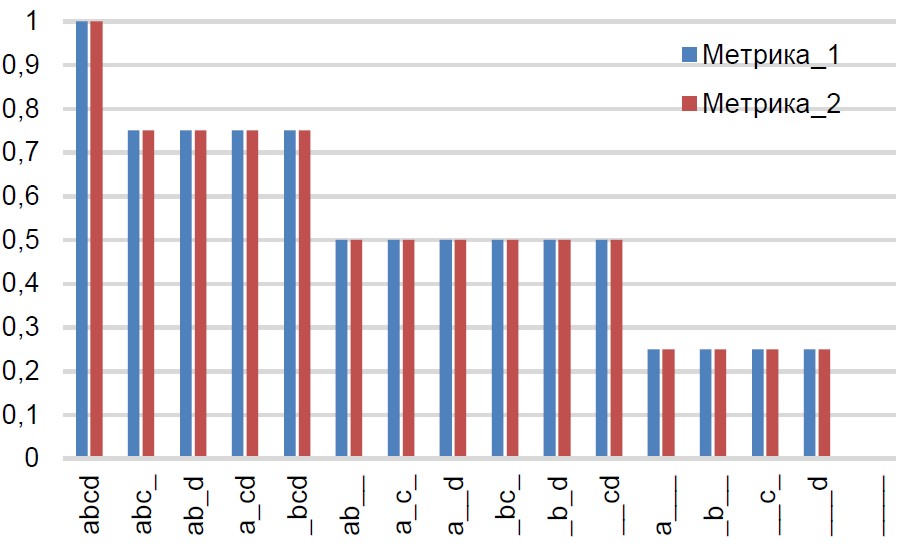 Рис. 3. Гистограмма результатов вычисления метрики_1 и метрики_2 для группы тестов 3 (для сравнения строк с «abcd»)
