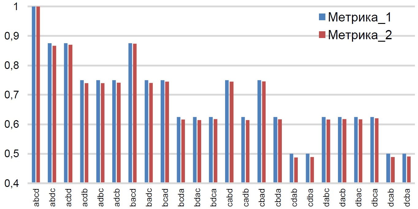 В-третьих, незначительное отличие значений метрики_2 от метрики_1, как и ранее, обосновано учетом позиции символов (точнее их середины). Так, например, перестановка двух ближайших символов во 2-й строке дает одинаковое значение метрики_1 – 0.8750, хотя метрика_2 учитывает их позицию, уменьшая свое значение для более отдаленных: «bacd» – 0.8734 (тест 7), «acbd» – 0.8703 (тест 3), «abdc» – 0.8672 (тест 2).