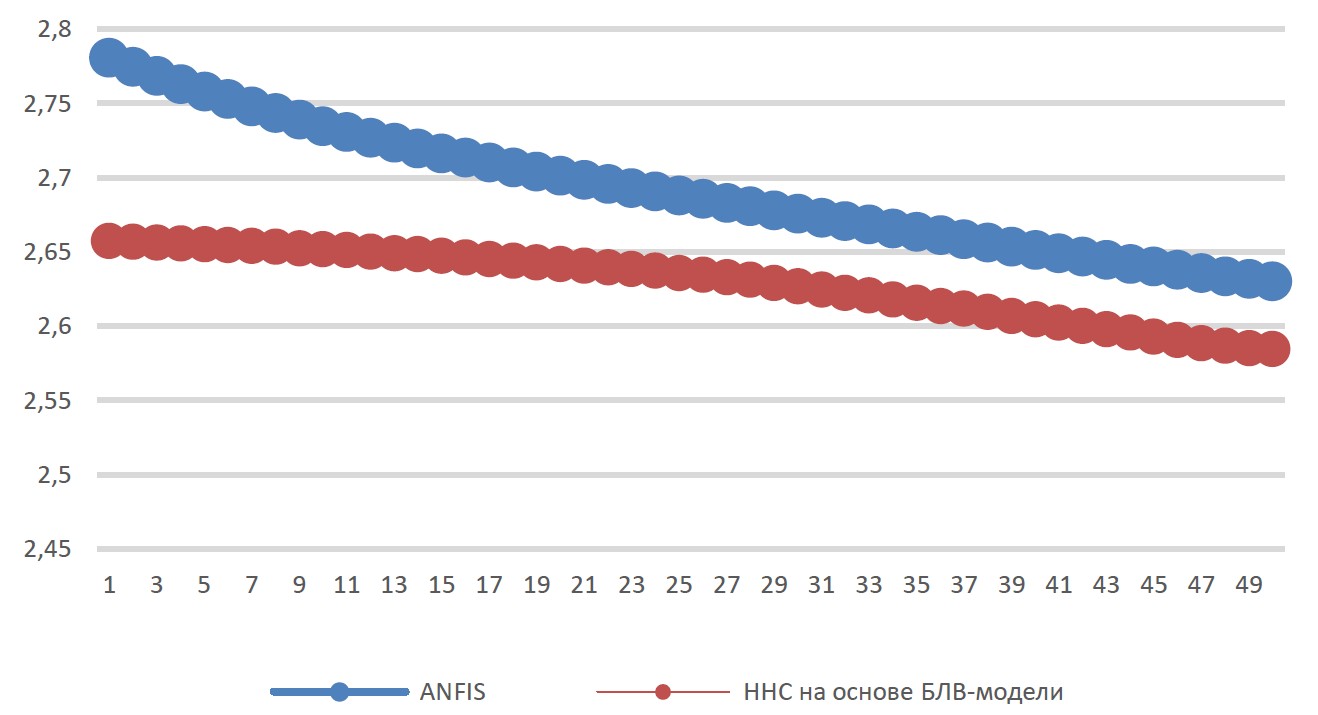 Видно, что разница значений RMSE у обеих моделей ННС невелика как на начальном этапе, так и после обучения, что свидетельствует о сравнимом качестве аппроксимации данных обеими моделями. При этом ННС на основе БЛВ-модели НВ в отличие от ANFIS демонстрирует тенденцию уменьшения значения этого показателя в ходе обучения.