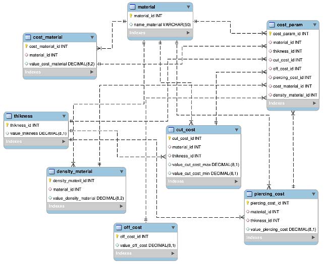 cost_param – стоимостные параметры для марок материалов и соответствующих толщин из таблиц material и thikness соответственно.