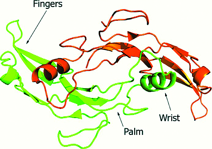 Биологический димер GDF11 состоит из двух копий асимметричной единицы [84, 107, 108]. Асимметричная единица состоит из одной полипептидной цепи GDF11 и принимает каноническую гомодимерную форму семейства TGFβ в результате кристаллографической симметрии. Данную структуру можно сравнить с “рукой”: (рис. 1): четырехцепочечный β-лист, состоящий из “пальцев”, структура цистинового узла занимает “ладонь”, а α-спираль образует “запястье”. В активной димерной форме “ладони” мономеров связаны одной дисульфидной связью в антипараллельной конфигурации. Перемежающаяся упаковка соседних димеров приводит к контактам не только между “пальцами” β-листа соседних молекул, но также между “запястьем” главной спирали родственной димерной единицы и такими же “пальцами” соседних молекул [84]. Обширные кристаллические контакты наблюдаются между двумя димерами в асимметричной единице и с соседними молекулами, связанными с симметрией.