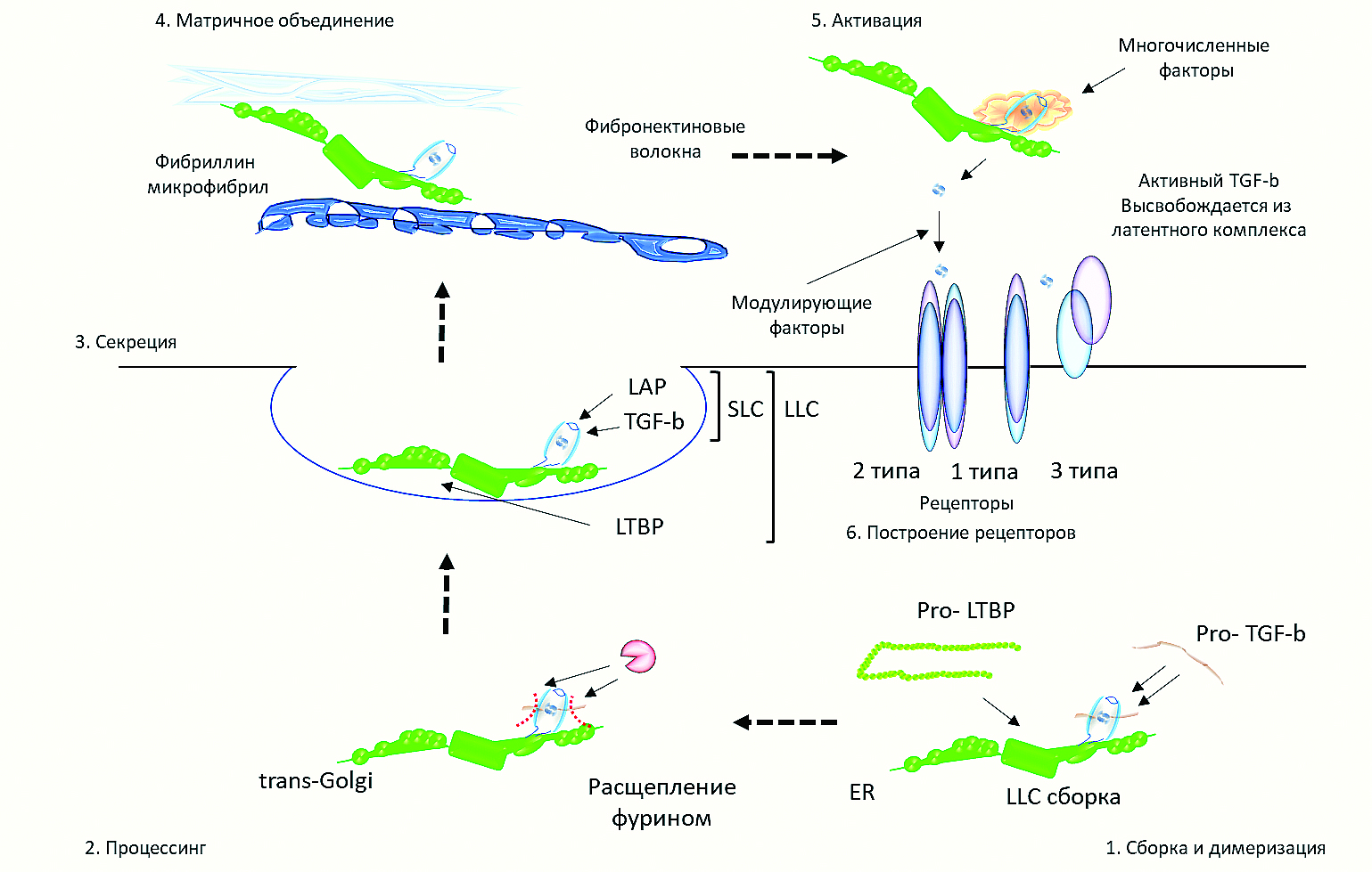 Рис. 2. Биосинтез белков семейства TGF-β. Адаптировано из [87]. 1 – TGF-β и латентный TGFβ-связывающий белок (LTBP) транслируются в ЭПР, где про-TGFβ димеризуется, а затем дисульфидно связывается с LTBP с образованием тройного комплекса; 2 – димер TGFβ отщепляется от своего пропептида (ассоциированный с латентностью пептид [LAP]) в транссети Гольджи, но TGFβ и LAP остаются прочно связанными посредством нековалентных взаимодействий, образующих большой латентный комплекс (LLC); 3 – после секретирования LTBP может связывать различные матричные волокна, которые изолируют латентный TGFβ, пока он не высвобождается активатором; 4 – затем латентный комплекс активируется одним из нескольких потенциальных механизмов, высвобождая зрелый TGFβ; 5 – активный TGFβ может связываться с рецепторами клеточной поверхности; 6 – хотя другие факторы также могут связывать активный фактор роста на этой стадии: ингибировать либо способствовать связыванию с рецептором.
