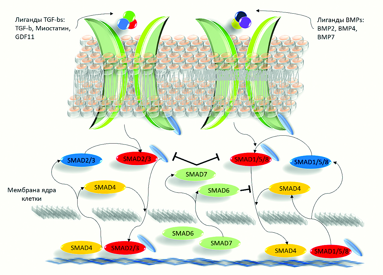 Основным сигнальным путем, посредством которого GDF11 оказывает свои биологические эффекты, является путь TGF-β/SMAD. SMAD представляет собой семейство внутриклеточных белков, принимающих сигналы от множества лигандов, таких как активин, ингибин, BMP, GDF, TGFβ и др. [37, 62]. Белки этого семейства составляют три функциональных класса: SMAD-рецепторы (R-SMAD), SMAD-медиаторы (Co-SMAD) и SMAD-ингибиторы (I-SMAD) [76]. К R-SMAD относятся SMAD1, SMAD2, SMAD3, SMAD5 и SMAD8. К Co-SMAD относится только SMAD4. I-SMAD состоят из SMAD6 и SMAD7 [91].