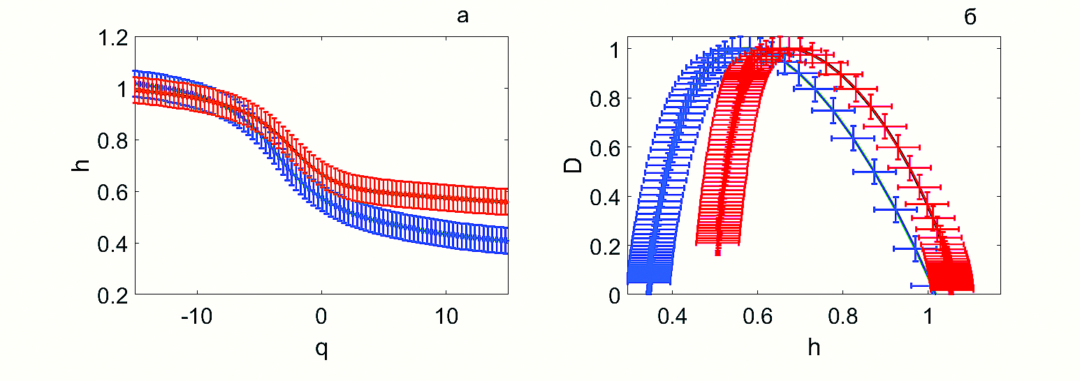 На рис. 2 приведены примеры зависимостей h(q) показателя Гёльдера от значения q (рис. 2а) и спектров сингулярности (рис. 2б) для ЭЭГ здорового человека. Голубые кривые соответствуют участкам над лобными областями (Fp1, Fz, F3, F4), а красные кривые – участкам над центральными (С3, С4), затылочными (О1 и О2), теменными (Р3, Р4 и Pz) и височными (Т5 и Т6) областями.