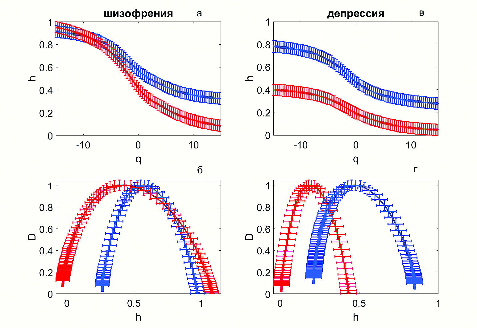 Рис. 3. Зависимости h(q) (а, в) и спектры сингулярности (б, г) для паттернов ЭЭГ больного шизофренией (а, б) и депрессией (в, г). Лобные и центральные отведения (F3, Fz, F4, C3, C4) (голубые кривые), затылочные (O1, O2), теменные (P3, P4, Pz) и (T5, T6) височные отведения (красные кривые) (данные из [12]).