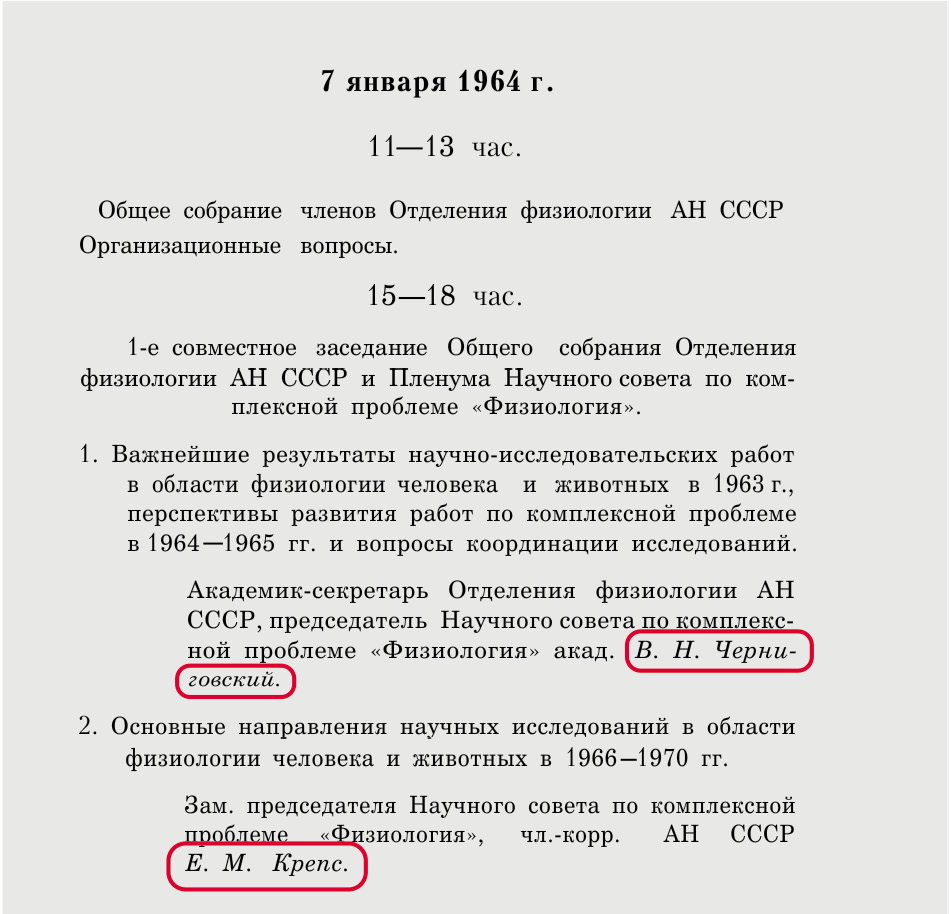4. Fig. 3. Reports by Academician V.N. Chernigovsky and Corresponding Member of the USSR Academy of Sciences E.M. Kreps at a meeting of the Department of Physiology.