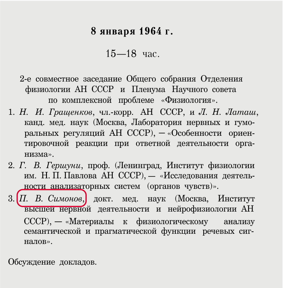 9. Fig. 8. Report by Doctor of Medical Sciences P.V. Simonov at a meeting of the Department of Physiology of the USSR Academy of Sciences.