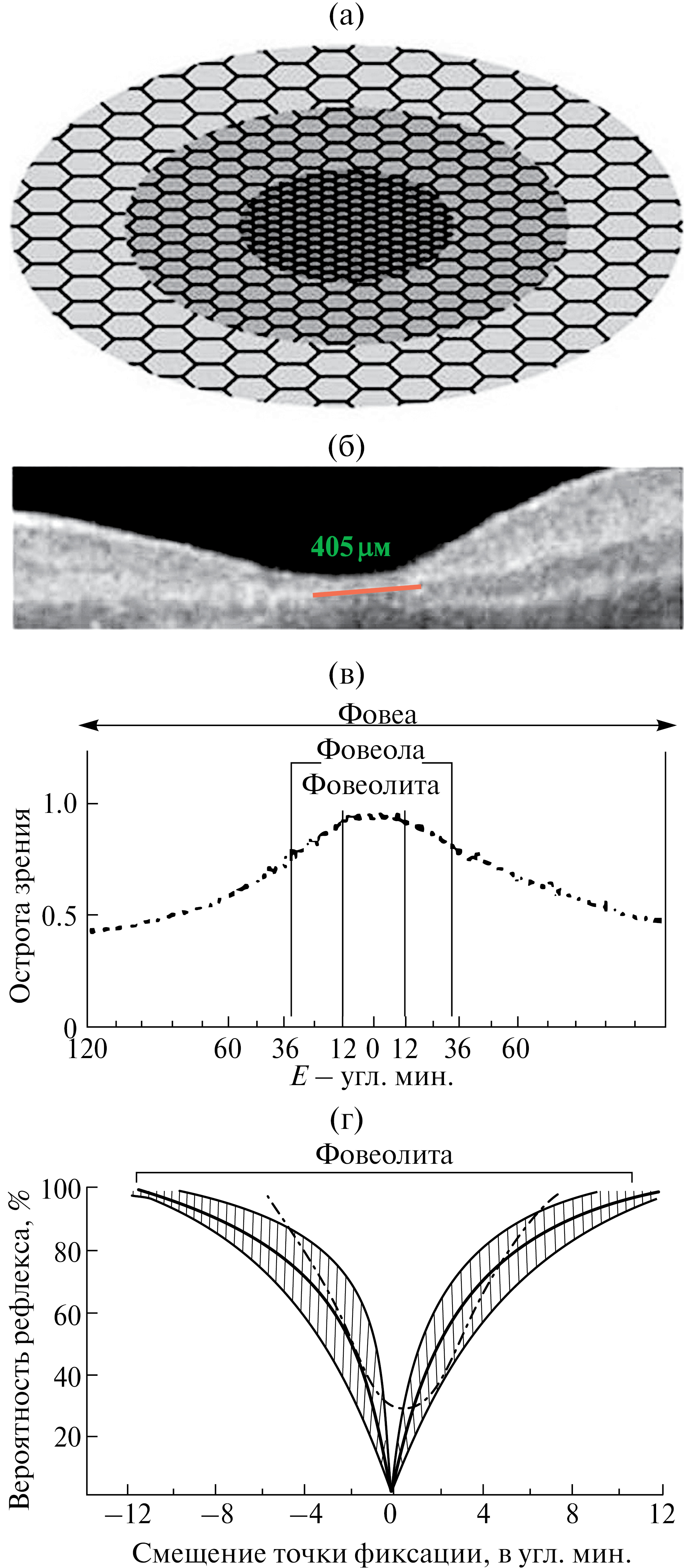 На рис. 1 показано взаимное расположение фовеа, фовеолы и фовеолиты. Вверху этого рисунка (рис. 1а) дана схема изменения плотности упаковки рецепторов и их толщины. Структура изменения толщины сетчатки хорошо видна на срезе, полученном с помощью оптико-когерентной томографии (ОКТ) через центр фовеа, что показано на рисунке 1б. Зависимость изменения фовеолярной остроты зрения от эксцентриситета и срез центральной части сетчатки представлены на рисунке 1в [8—10]. На рисунке 1г показана известная “зона нечувствительности сетчатки”, нечувствительности перевода взора к смещению стимула [18, 29]. Эта “зона нечувствительности” соответствует по угловым размерам фовеолите, так как это однородная зона с одинаковым и максмальным разрешением в своих пределах. На рисунке 1в представлена зависимость остроты зрения от эксцентриситета в центральной части сетчатки [120]. На этой кривой зависимости остроты зрения от эксцентриситета хорошо видно плато, соответствующее расположению фовеолиты. Если в пределах фовеолиты, области с одинаковой и самой высокой остротой зрения, смещать стимул, то нет необходимости перевода взора на этот стимул, т.е. это – “зона нечувствительности”.