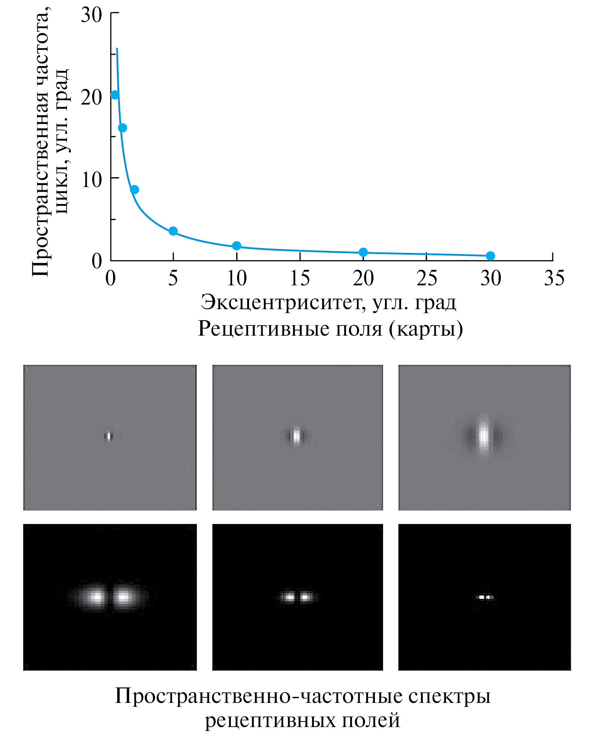 Рис. 3. Зависимость пиковой пространственной частоты от эксцентриситета. Примеры двумерных весовых функций рецептивных полей, определяющих эту зависимость [11, 49, 64, 146], показаны в середине, внизу приведены их ПЧ спектры.