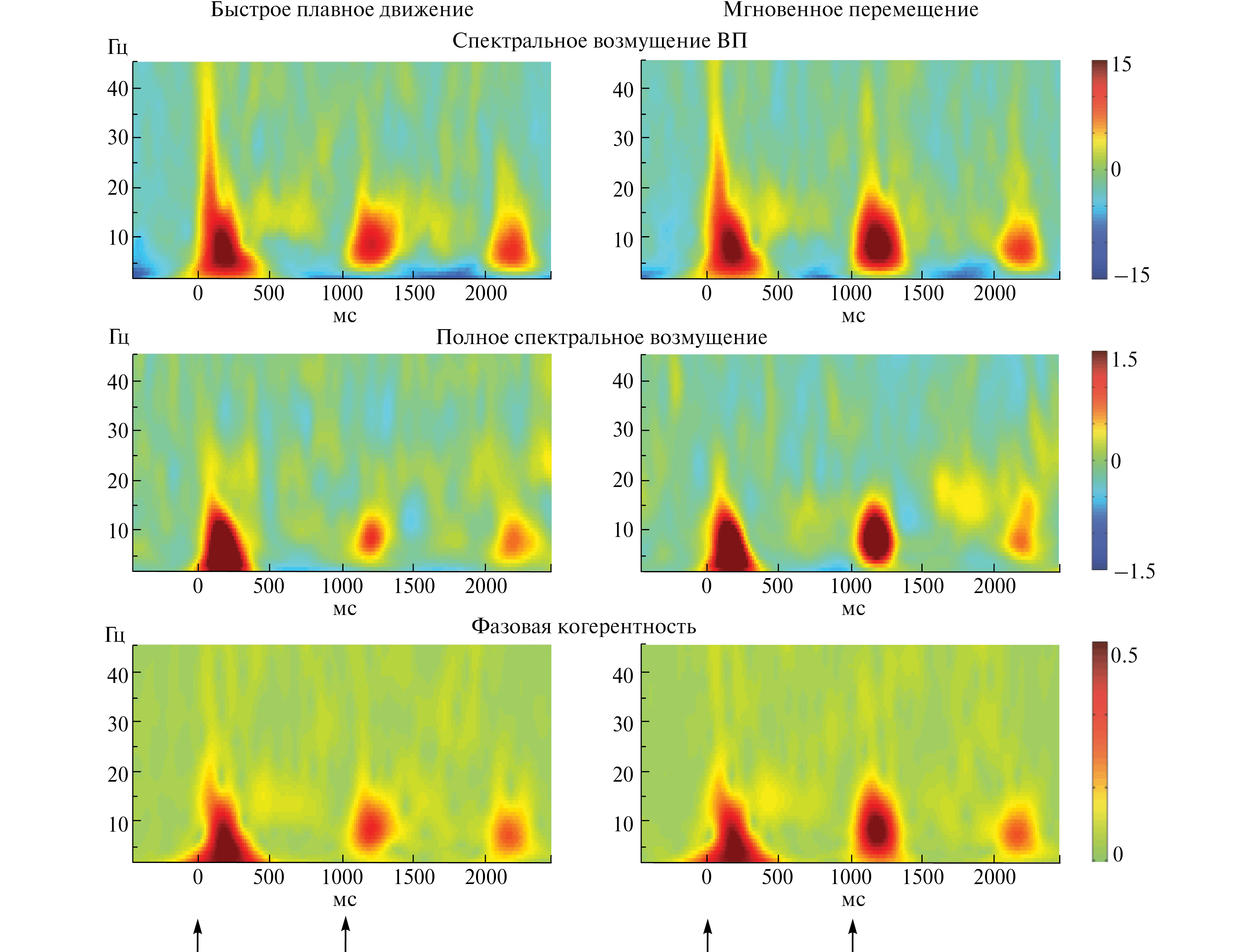 Рис. 5. Частотно-временное представление реакций на быстрое и мгновенное перемещение стимула (усреднение по 24 фронто-центральным отведениям) [104] (с изменениями). Верхняя панель: спектральное возмущение ВП (вызванное ERSP). Средняя панель: спектральное возмущение отдельных эпох (полное ERSP). Градиентные шкалы верхней и средней панели показывают мощность ERSP, выраженную в дБ. Нижняя панель: фазовая когерентность отдельных эпох (ITC). Градиентная шкала показывает величину ITC в относительных единицах. Стрелками отмечены момент включения стимула и момент начала изменения межушных различий ΔT.
