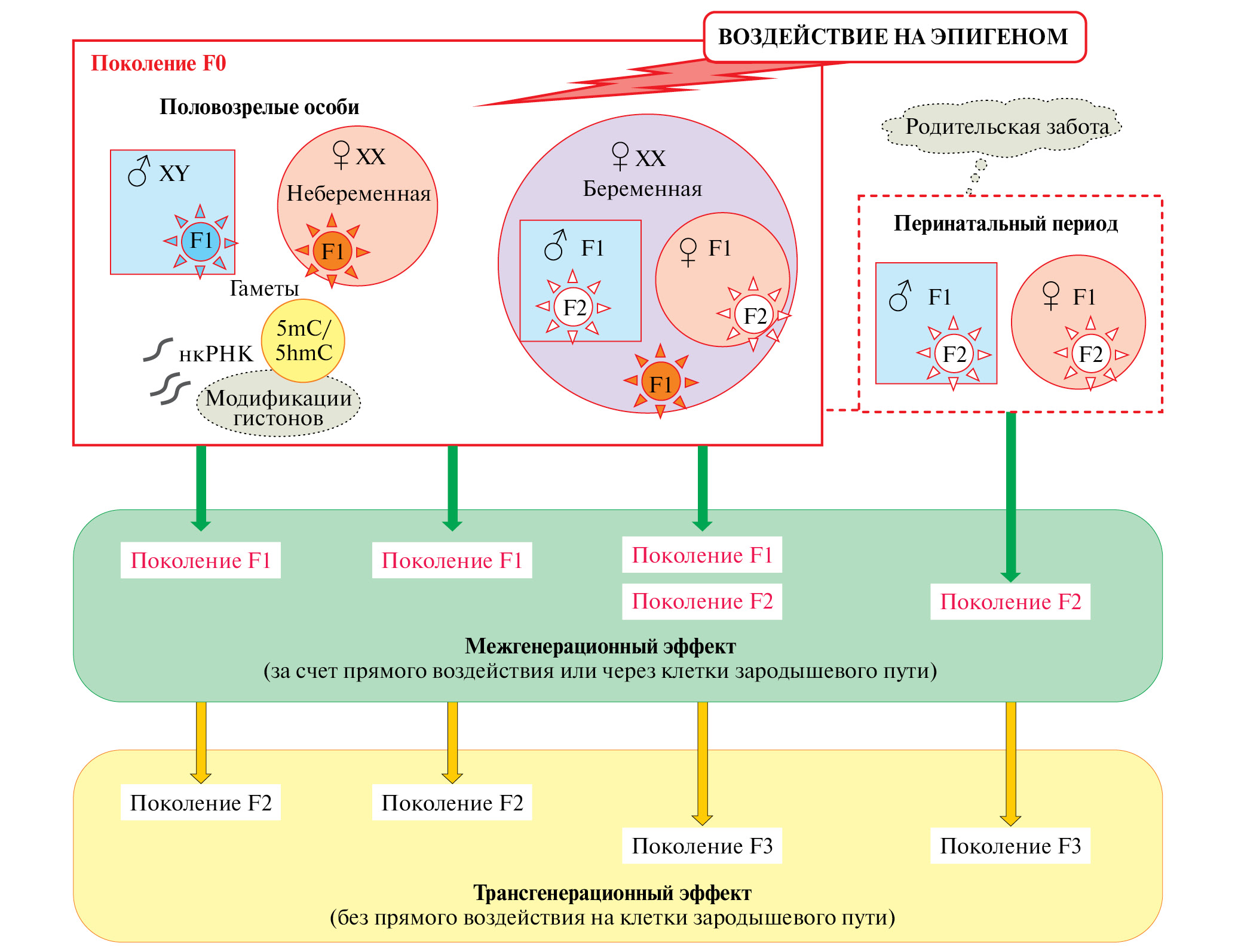 Ряд исследователей считают эти два термина взаимозаменяемыми, тогда как другие все же рекомендуют дифференцировать эти варианты эпигенетического наследования в соответствии с определением, предложенным Скиннером [188]. Так, при межгенерационном наследовании эпигенетические изменения в клетках зародышевой линии происходят в результате прямого (непосредственного) воздействия неблагоприятных факторов либо до зачатия, либо во время беременности. Сохранение возникших эпигенетических изменений в гаметах может приводить к фенотипическим нарушениям у потомства, причем у них риск развития заболевания может отличаться по сравнению с родителями. Когда воздействие происходит до зачатия, мужские и женские половые клетки подвергаются одинаковому воздействию, что может привести к передаче изменений следующему поколению. В этом случае прямое воздействие на половозрелый организм самцов (F0) и небеременных самок (F0) может проявиться фенотипически у их потомства (F1) из-за возникших на различных стадиях гаметогенеза эпигенетических нарушений в сперматозоидах или ооцитах. Когда же прямому воздействию подвергается уже беременная самка (мать, F0), то это может отразиться не только на ее детях (первое поколение F1), но и на внуках (второе поколение F2) в результате внутриутробного влияния на эмбрион (F1), в котором закладываются половые клетки (сперматогонии, оогонии) (т. е. будущее F2) [69, 77, 115, 160]. Для поколений F1 и F2 здесь имеет место пренатальный эффект, поскольку нельзя исключать возможности того, что воздействию фактора окружающей среды они подвергались одновременно с беременной самкой F0 (Вейсман назвал это явление “параллельной индукцией”) [195].