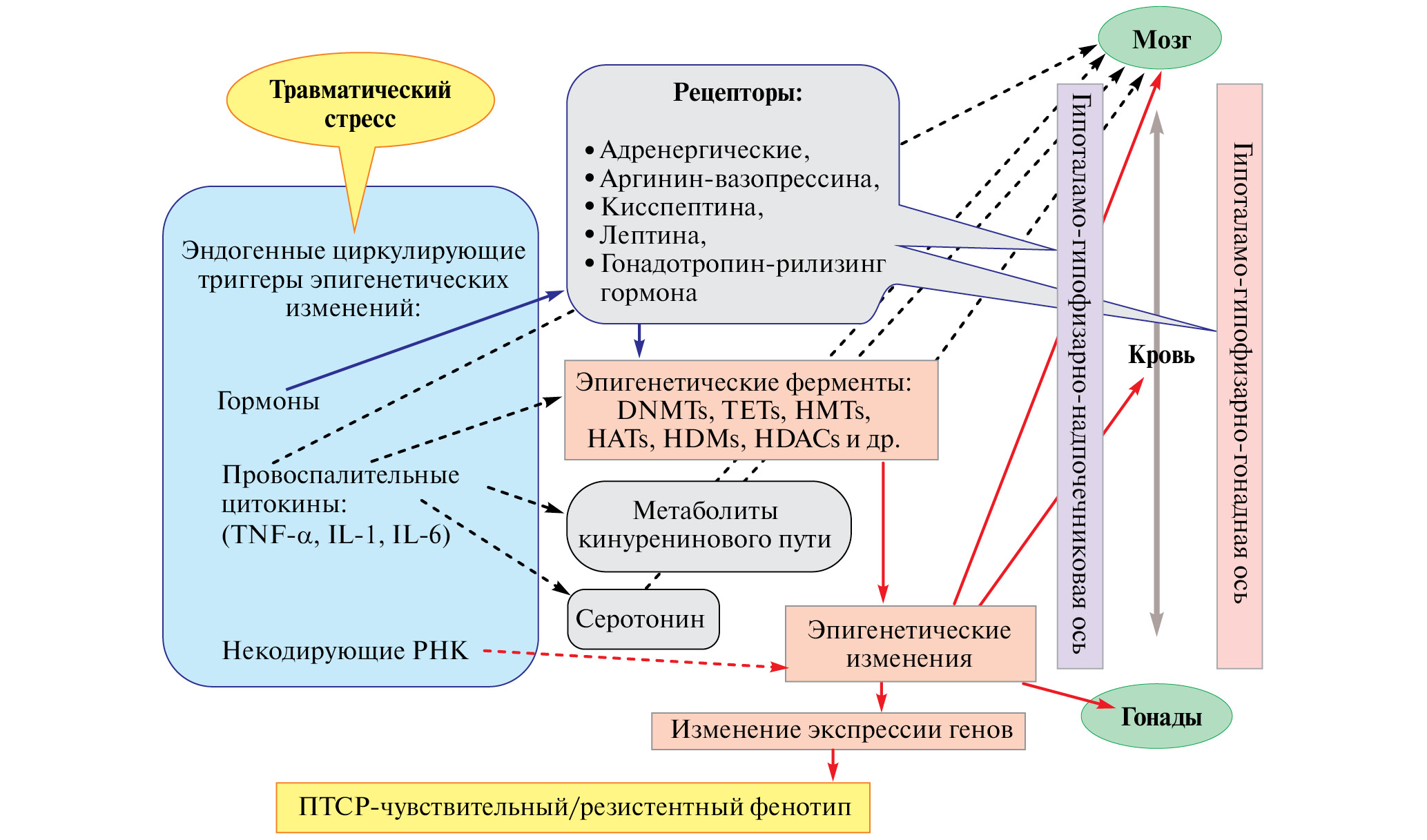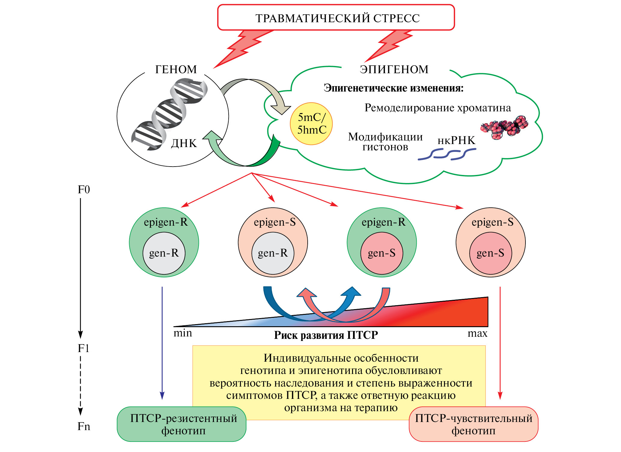 Как показывают современные данные, воздействие психогенной травмы – необходимый, но недостаточный фактор для развития ПТСР. За возникающие индивидуальные реакции отвечает не только жизненный опыт (ранее перенесенные травмирующие события), но также индивидуальная способность организма компенсировать такие воздействия на молекулярном уровне, за который отвечают его геном [7, 11, 34, 184, 192] и эпигеном [26, 35, 84, 100, 112, 167, 204]. Эпигенетические модификации (метилирование/гидроксиметилирование ДНК, модификации гистонов, нкРНК) в данном случае выступают в качестве динамичных биомаркеров (“нанометок”) воздействия окружающей среды на геном, которые могут при определенных условиях исчезать либо сохраняться не только у особей, непосредственно подвергшихся психогенной травме, но и наследоваться их потомками в ряду поколений [19, 46, 55, 85, 151, 157, 171]. В отличие от генетических мутаций динамический характер эпигенетических изменений, вызванных факторами внешней и/или внутренней среды, обусловлен тем, что они не изменяют структуру ДНК, т. е. ее нуклеотидную последовательность [41], но при этом способны сохраняться в ряду митотических делений, а также передаваться по наследству [157, 171, 189, 197].