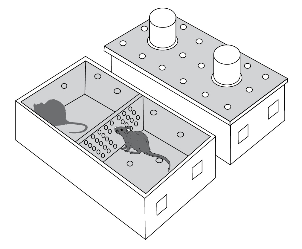 Во всех многолетних исследованиях модель применялась единообразно. В эксперименте используются половозрелые самцы мышей, проживавшие по 8–10 особей в стандартных пластиковых клетках размером 36 × 23 × 12 см – групповые животные [55, 59, 72]. Оптимальный возраст 2,5 мес. Максимально сходных по массе самцов одной и той же линии из разных клеток попарно помещают в экспериментальные клетки размером 28 ×14 ×10 см, разделенные на два равных отсека прозрачной перегородкой с отверстиями, позволяющей животным видеть, слышать и воспринимать запахи друг друга, но предотвращающей физический контакт (условия сенсорного контакта) (рис. 1).