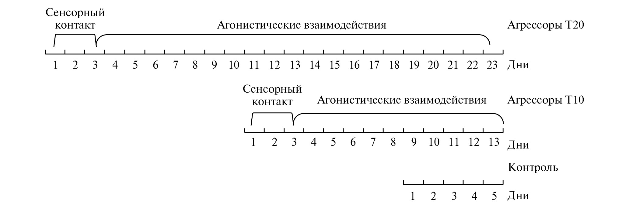 Рис. 2. Экспериментальный дизайн для изучения динамических изменений нейробиологических показателей после повторного опыта агрессии. Сравниваются контрольные самцы без последовательного опыта агонистических взаимодействий (контроль), самцы после 10 и 20 дней ежедневных конфронтаций, в процессе которых самцы демонстрировали агрессию, сопровождавшуюся победами. Сходный дизайн используется для изучения эффектов повторного опыта социальных поражений.